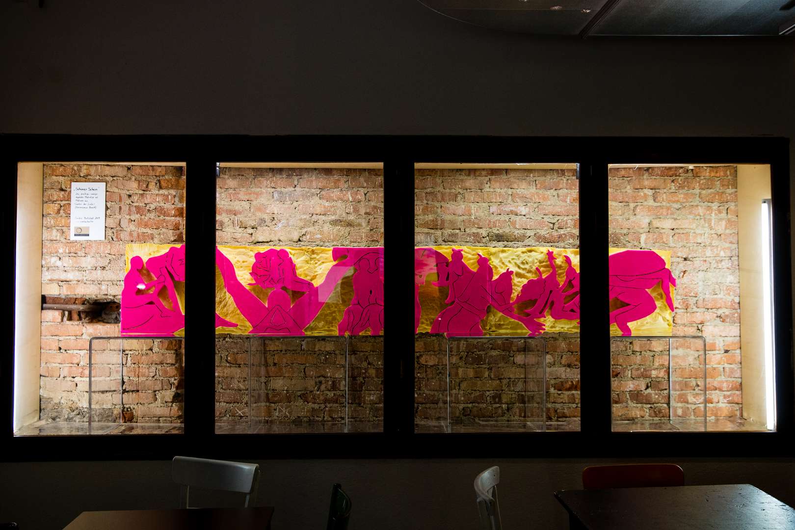 Frei nach dem "Garten der Lüste" von Hieronymus Bosch ist das magentafarbene Relief in eine abgelebte, ranzige Berliner Matratze geschnitten und gerissen. Das Motiv lustvoll agierender Silhouetten entfaltet erst seinen Sog, weckt Neugier und Anziehung, um aus der Nähe betrachtet durch simple Alltäglichkeit, Makelhaftigkeit und Brüchigkeit des Materials zu ernüchtern.